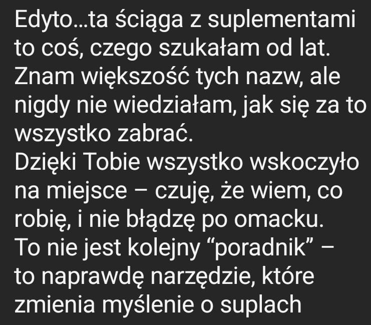 Stworzyłam konkretny, uporządkowany przewodnik, który przeprowadzi Cię przez świat suplementów – prostym językiem, bez chaosu i presji.