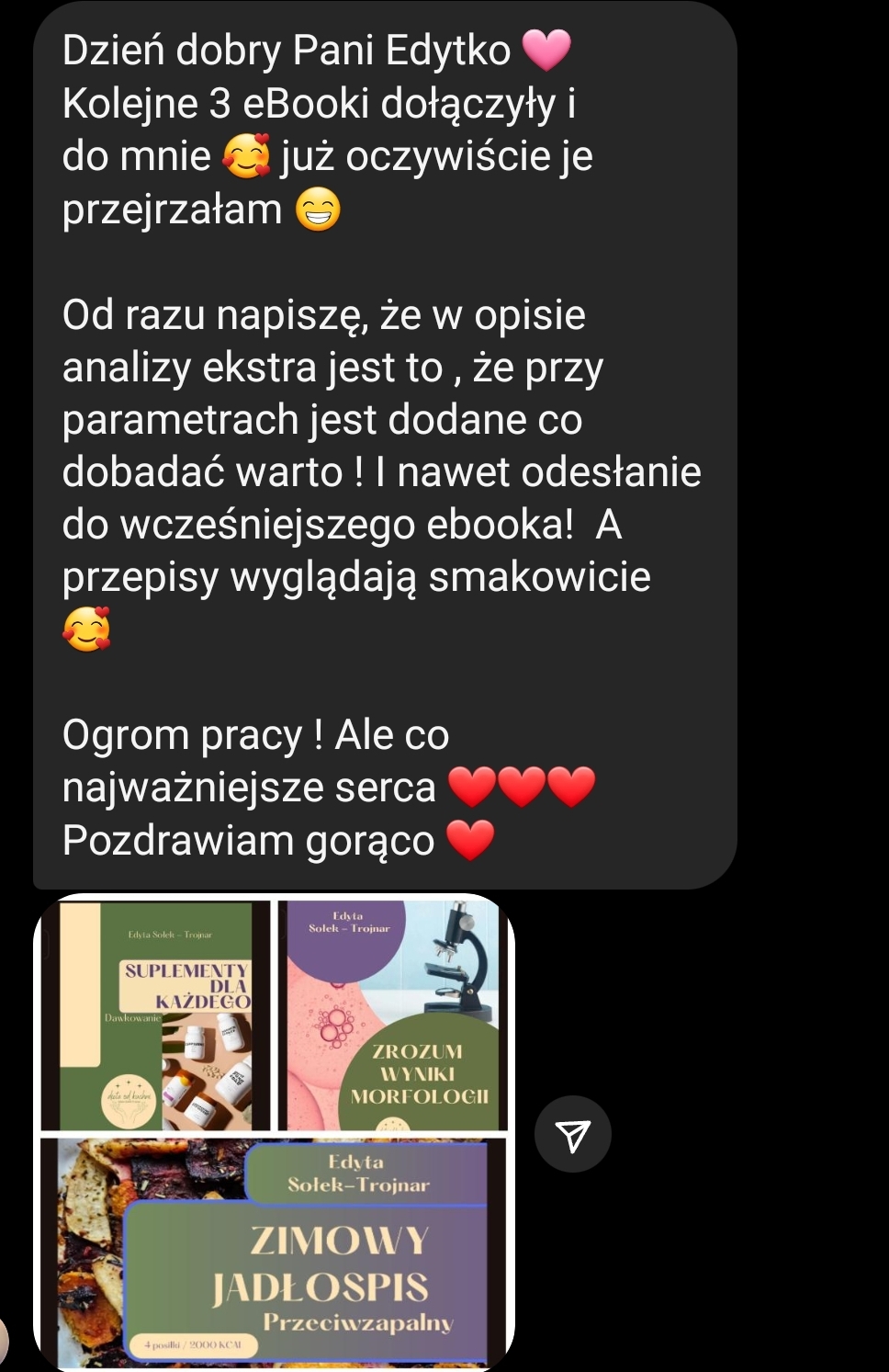 Właśnie dlatego stworzyłam ten e-book – PROSTY, PRZEJRZYSTY I PEŁEN KONKRETNEJ WIEDZY, abyś bez stresu i zagubienia mogła przeanalizować swoje wyniki i świadomie zadbać o zdrowie.